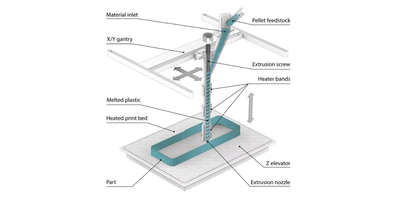 3D Systems의 펠릿 압출 기술은 FGF(융합 입상 제작)이라고도 하는데, 압출 툴헤드가 열가소성 피드스톡을 녹인 후 녹인 소재 를 레이어 방식으로 레이어 한다는 점에서 FFF/FDM(융합 필라멘트 제작) 공정과 유사합니다. 제작할 수 있습니다. 그러나 3D Systems의 펠릿 압출은 필라멘트 기반 프린터와 비교할 때 훨씬 높은 처리량 을 가능하게 하며 상당한 비용을 절감합니다.