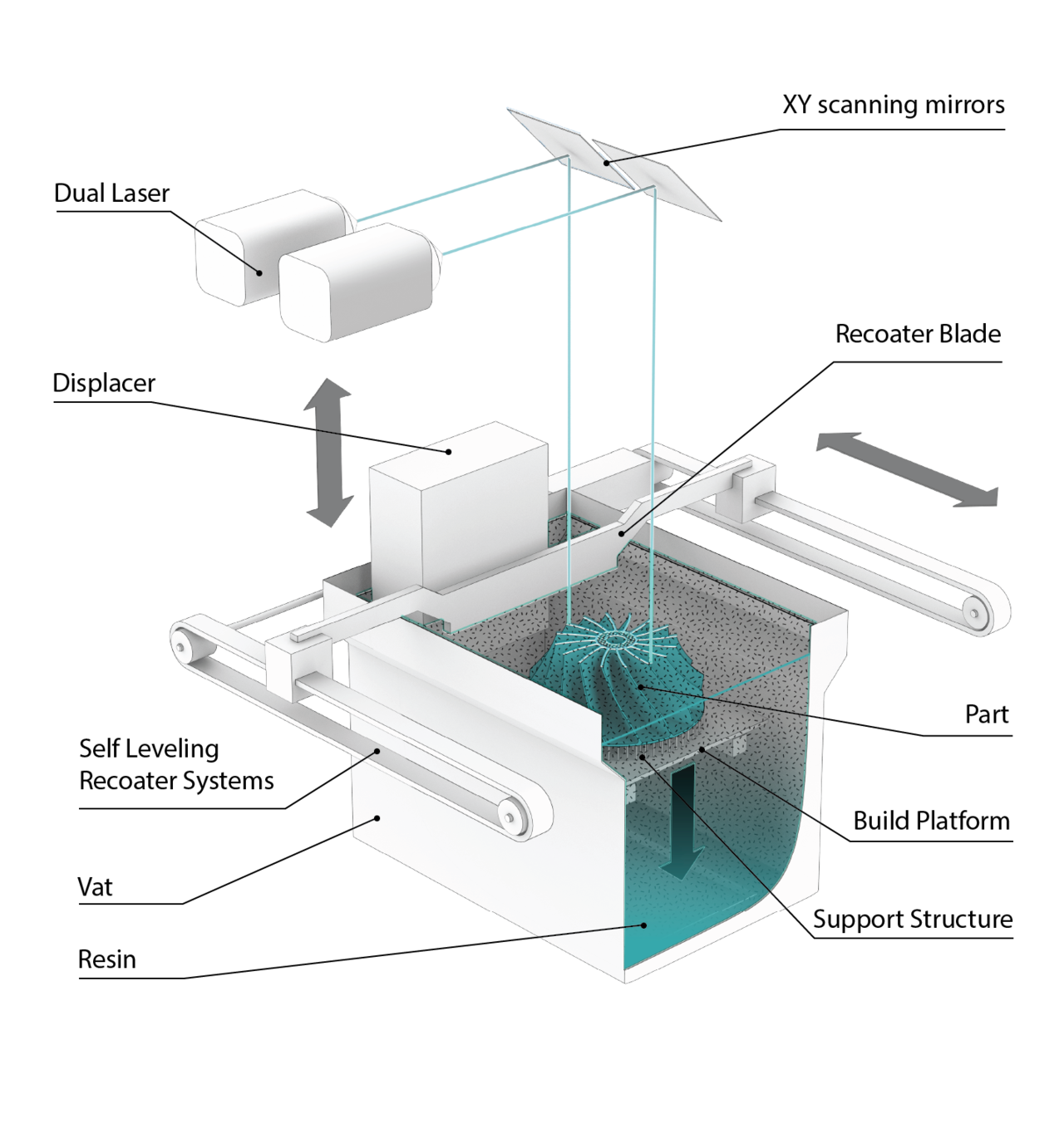 재료 변경은 그 어느 때보다 쉬워졌습니다. PSLA 270은 애플리케이션에 가장 적합한 다양한 재료 Vat 크기를 수용하도록 설계된 이동식 카트를 갖추고 있습니다. Vat 시스템은 엘리베이터, 디스펜서, 리코터가 함께 사용되는 수지 통으로 중첩된 상태를 유지하도록 설계되었습니다.